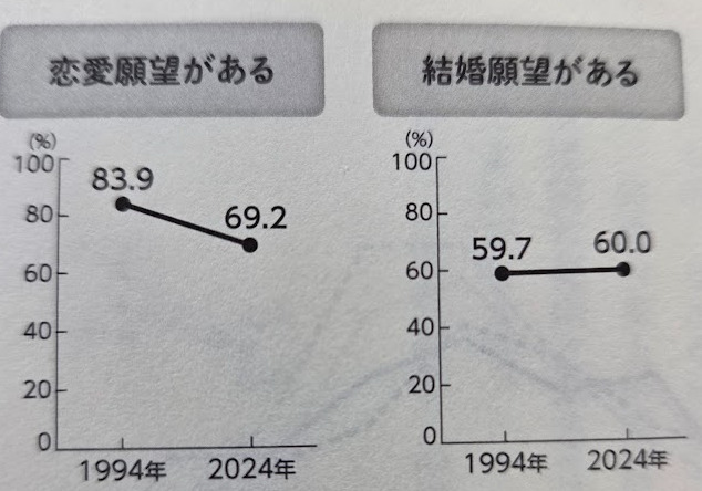 他のさまざまな調査結果と同じく、本書もまた、若者において恋愛が退潮しているさまを示している。他方、結婚願望には変化はみられない。