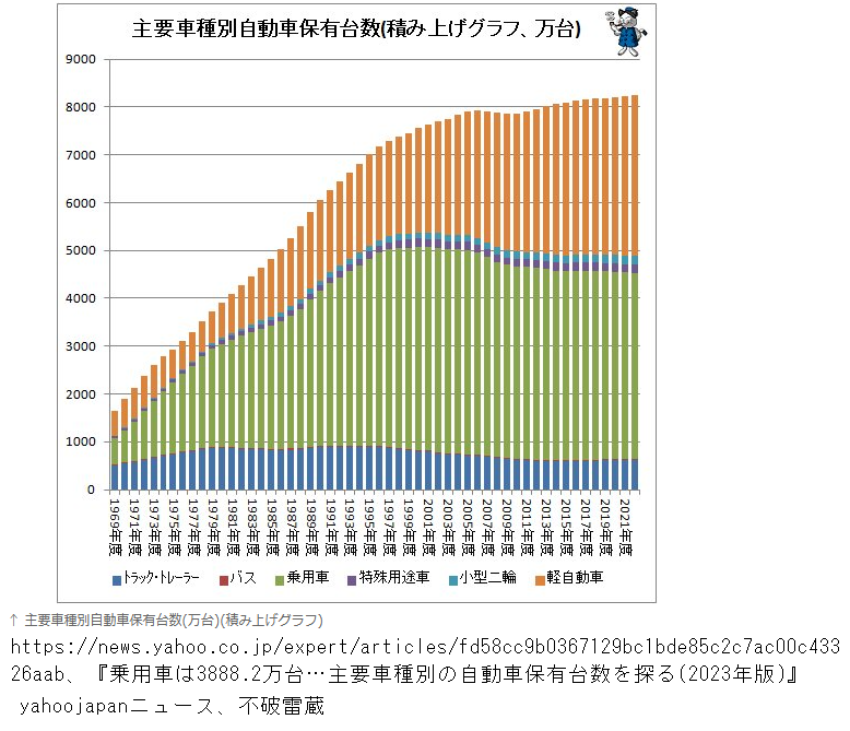 これは不破雷蔵さんのyahooニュースの記事 から引用したグラフだが、グラフを見ると、私が生まれた1975年の日本の自動車保有台数は3000万台にも届いていない。内訳にトラック・バス・特殊用途車両が800万台程度あることを差し引くと、自家用車の実数は多く見積もっても2000万台弱と推察される。